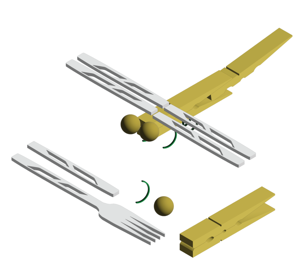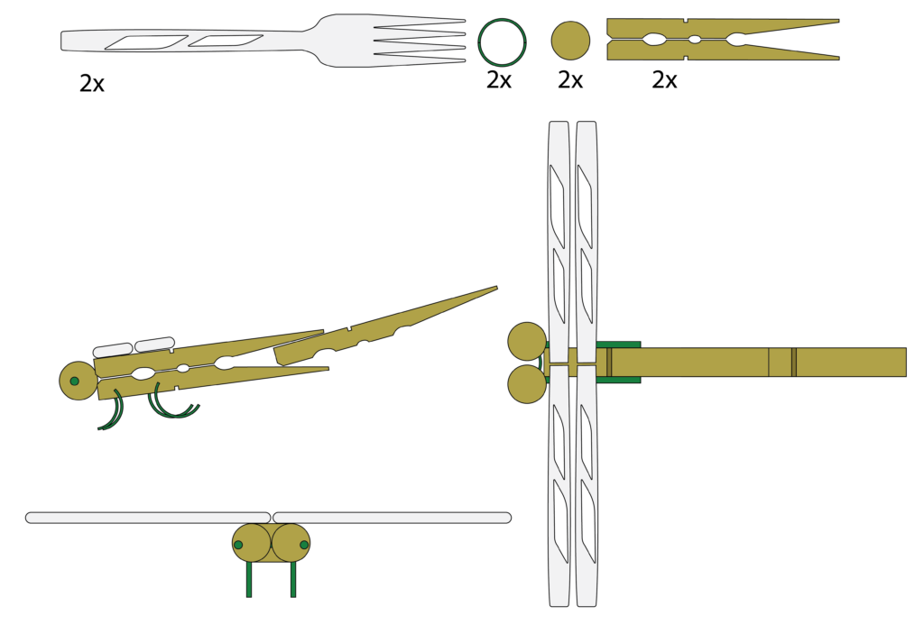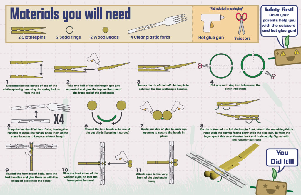 When building the Recyclobot we went with a dragonfly for inspiration based off of the shape of a clothespin and the texture / transparency of a plastic fork handle. By building the Recyclobot, it is made easier to visualize how to create text and image-based steps for the instruction sheet.
