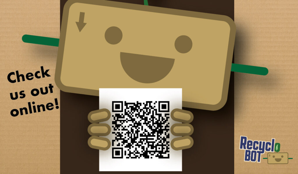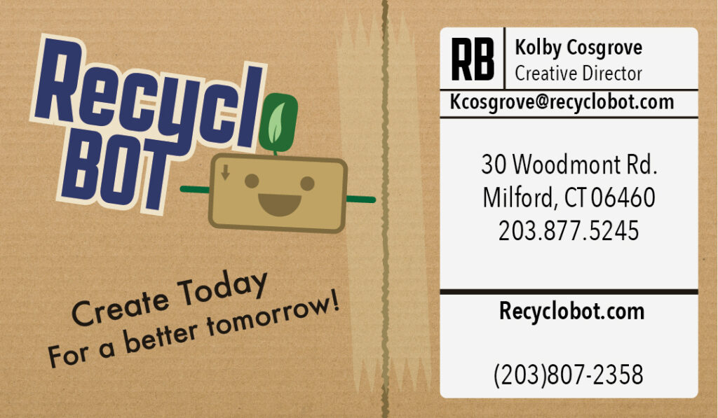 We also created a business card to contact the designer of the monthly sheets that highlights a cardboard texture, the logo and contact info formatted like a packaging label. The back has Recyclo Boy presenting a QR code that would theoretically link you to the RecycloBot website.