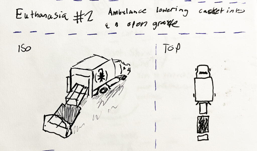 Upon Critique we had honed in on two of the options above, one being the hospital in the coffin shape, and the second being the iron flat-lining a heartbeat. It was decided that both concepts would be loosely modeled to showcase which object would be better in practice.