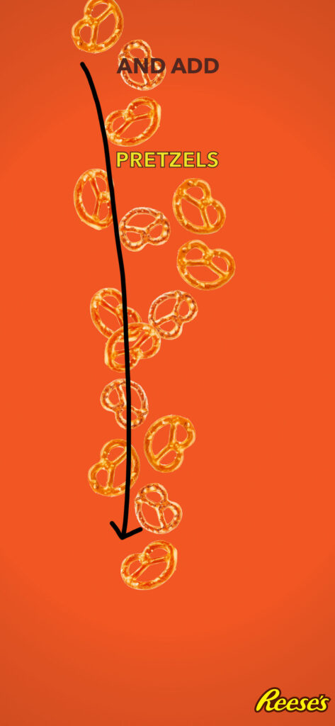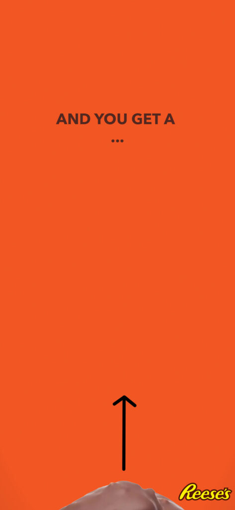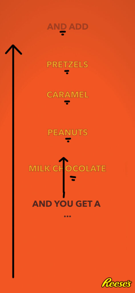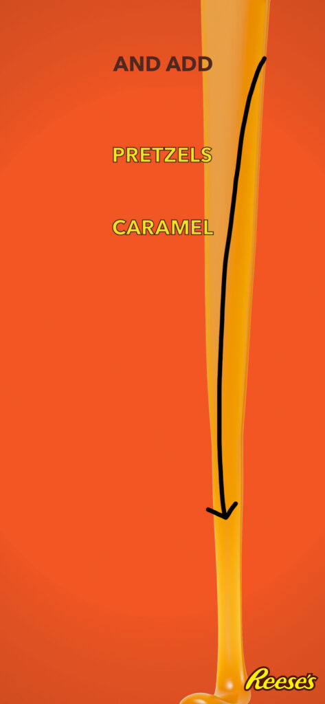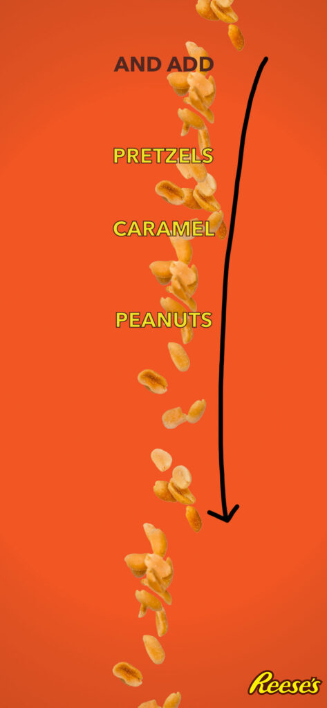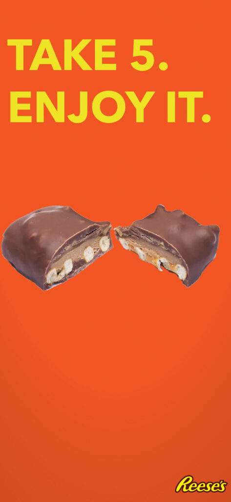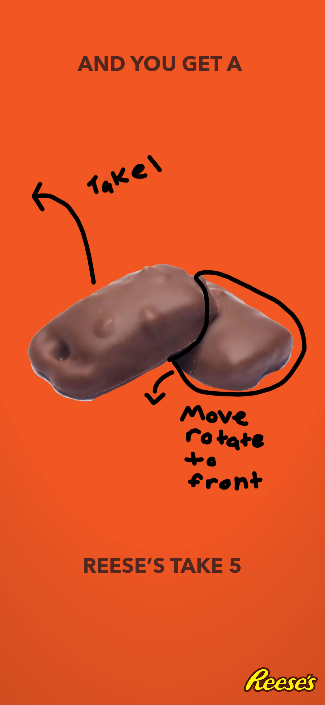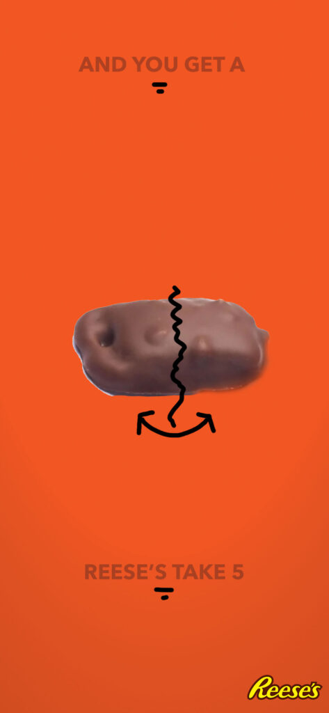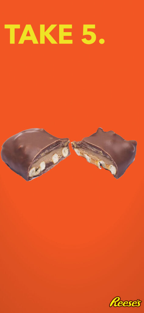 In starting to create the reel was the research phase where we looked into how Reese’s advertises and makes posts for their main product and translate those features into our Reel for the Reese’s Take 5. These features include the Reese’s color scheme, the orange gradient background, the San-serif font typeface, for that we found a similar free font that is very comparable to Reese’s commercial font, and the iconic bite that is used in Reese’s “not sorry” campaign.