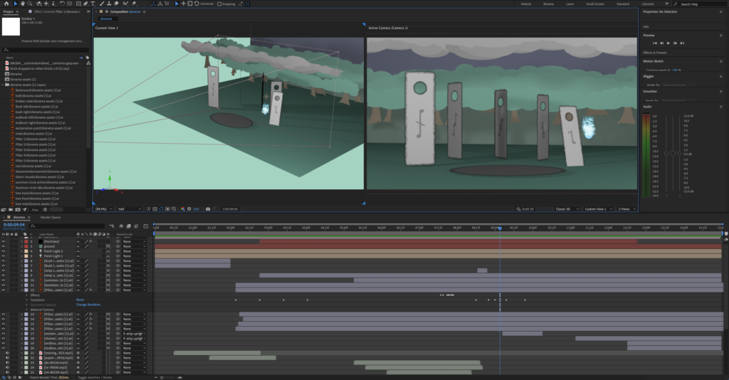Once within the animation software of Adobe After Effects we went through the process of importing all of my assets properly and getting them organized within the composition while still accounting for the use of three dimensional space. Then from there building on the animation using key framing techniques that act to create or mimic the principles of animation when it comes to the movement of my scene. Simple things added plenty of depth to the animation for example when the stones are hit they wobble and then collapse which acts to add more character to the animation.