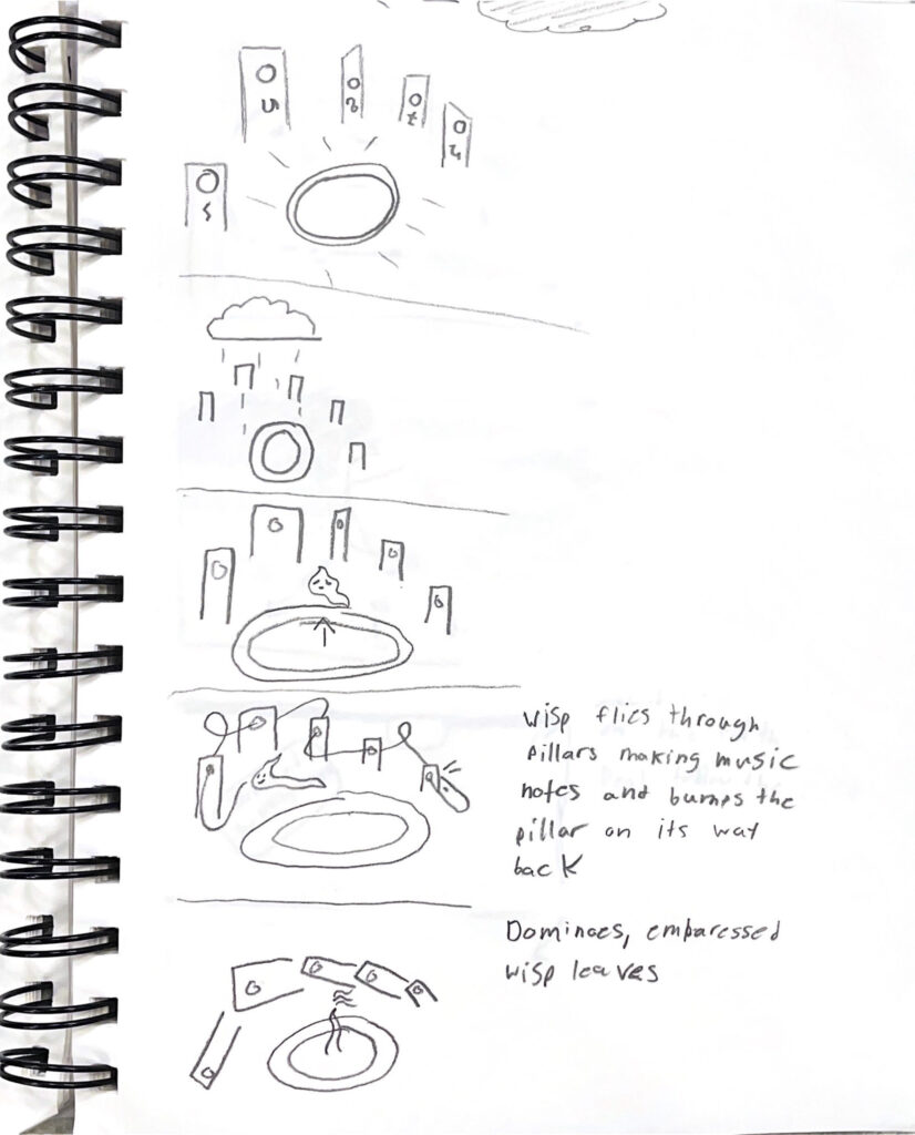 On the right is a short first run of a storyboard for the animation following how the wisp would move and interact with his surroundings. The goal being to portray the character as fun and lively as well as short tempered and bashful.