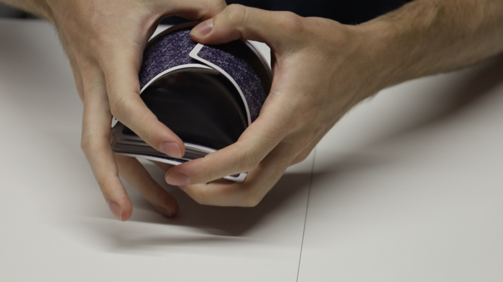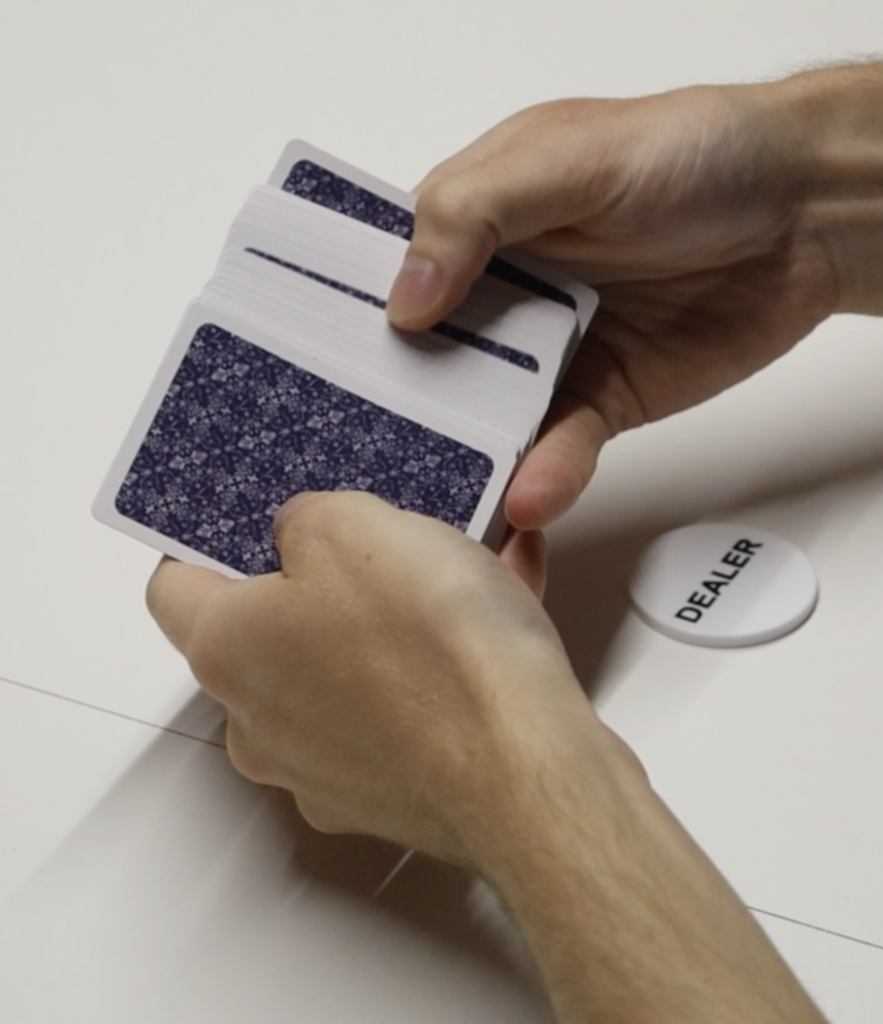 When recording it was important that we considered the proper setting to best capture the play area as well as have proper lighting and audio. We ended up using a small room that had a large table at its center with nondescript walls, additionally this room had overhead lighting with minimal buzz (enough so where it wouldn’t pick up on the mic). There were two main views using two cameras to ensure seamless cuts between wide angles on take which would make editing on wide shots much easier. For the close up shots we repeated key steps in the process with multiple new angles still taking advantage of multiple cameras. One such example of this was with the Flop, River, and Turn, where we took the same cards from the wide shot and placed them individually in a close up to align it as best we could to the seamless action in the wide recording.