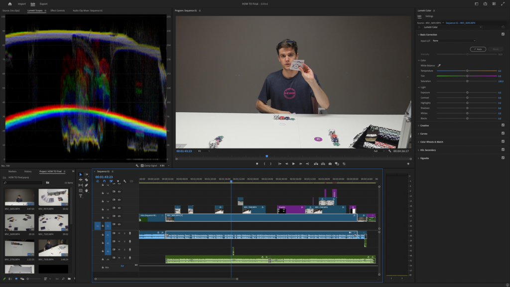 With all of the recording completed it was time to bring the videos into premier to be stitched together and edited. Most edits involved finding the right timing to cut to certain angles and making use of effects and graphics to embellish and build upon the overall video such as entering text or adjusting the exposure or white balance of the shots. Clips had to be cut at the proper times to create the greatest sense of continuity between shots and allow the actions made to seem fluid and natural maintaining viewer focus and understanding of the content.